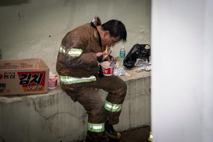 消防士、火災鎮圧後カップラーミョン