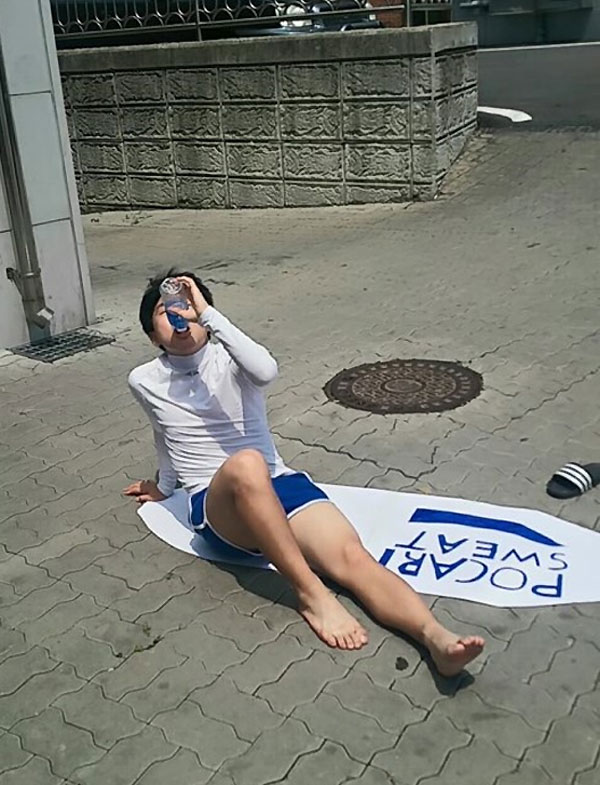 熱した運動場でしばらく走り回ったが、スリッパが足から'離脱'した。 接着剤が猛暑に溶けたため、ストラップが落ちていった。