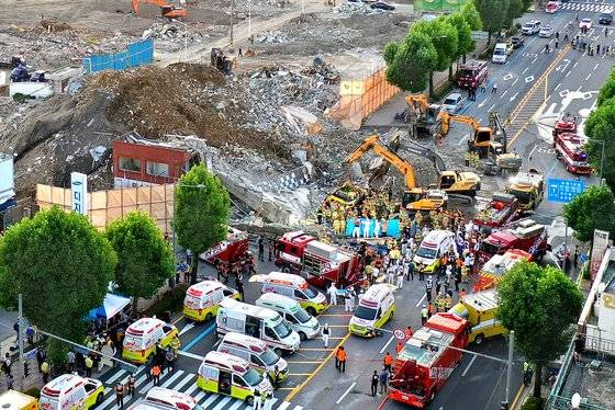 [ソウルミーナ]光州(クァンジュ)広域市東区鶴洞(トング·ハクドン)で撤去作業中だった5階建ての建物が道路側に崩れ、通りかかったバスが襲われた。 この事故で今のところ乗客のうち9人が死亡し、運転手を含む8人が重傷を負ったまま救助された。死亡者のうち17歳の高校生1人も含まれた。