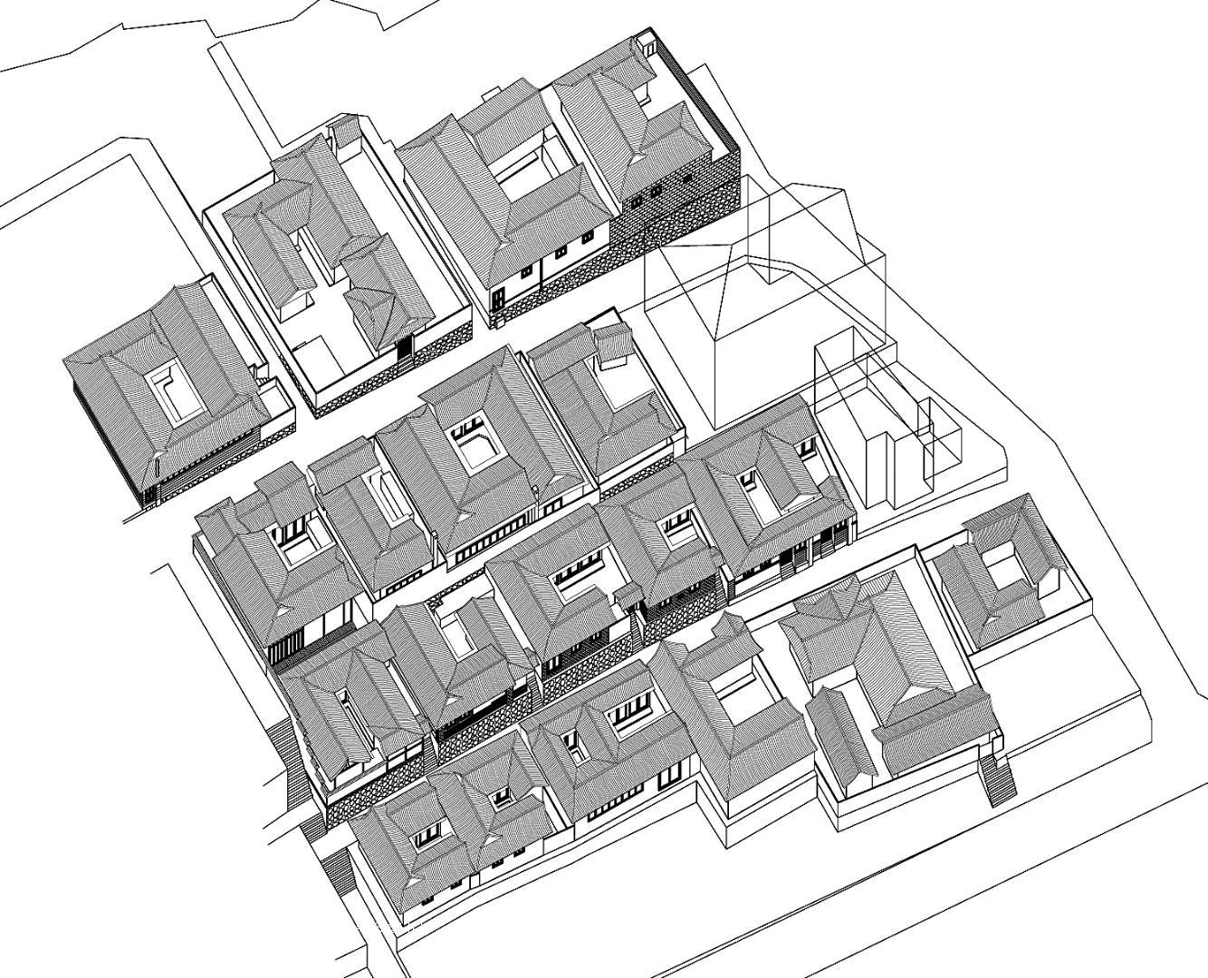 ここには現在もひとが住んでいる。当時であれば最新の分譲住宅に当時の生活様式のまま住むのだろう、家長夫婦を頂点として、ジジ・ババと若夫婦が同居する。当時の朝鮮は早婚だったから女性は20歳までに2~3人のこどもを生む。この間取りでも小さいこどもも数人いるだろう。もちろん女子供は奥から出てこないと知られている。嫁取り前の若夫婦の兄弟もいっしょに同居する。このように2~3世代がまとめて住んでいた多世帯住宅だったことが知られている。当時を研究した資料から俯瞰図で紹介しよう。